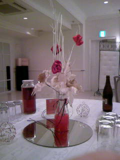 会場の飾り付けが全て新婦の手作りですごい~!ドレスとお揃いのミニ帽子の髪飾りをしていて、かわいーな~♪って思っていたら、なんとそれまで自分で作っていた!!あんたホントにすごいよ…。