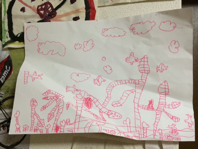 最近お絵描きにはまっている長男は、ダイニングで寝る直前までひたすら描いてました。