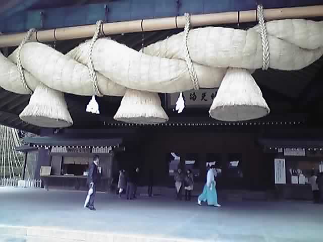 平成の大遷宮で御神体は御仮殿にいらっしゃいまして、お参りして旅の無事を願い、神楽殿の大きな注連縄を下からみんなで見上げて楽しみました。縄だ、テレビでよく見るあの縄だーって。