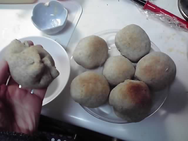 写真は出来上がったパン。手の上のは、長男作「ギョーザの形のギョーザパン」。