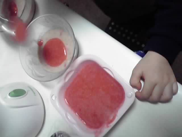 写真は、長男がムースにイチゴソースをかけているところ。気分はいっぱしのパティシエですな(笑)。