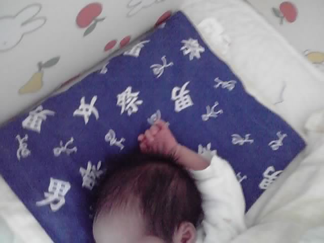 よく寝る次男、「あおきり男祭てぬぐい」を枕カバーにスヤスヤ…どんな夢を見てるのかな?